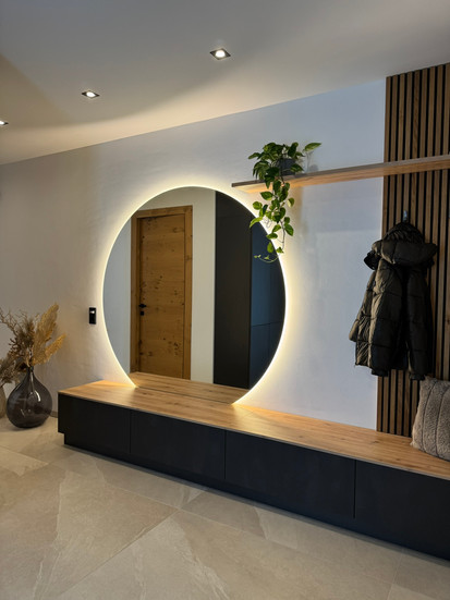 Der Vorraum mit integrierter Garderobe wird durch einen runden Spiegel mit indirekter Beleuchtung zum besonderen Highlight. Trotz dunkler Möbel wirkt der Eingangsbereich warm und einladend. Die Kombination aus funktionaler Garderobenlösung, modernem Spiegel und stimmungsvoller Beleuchtung verbindet Interior Design und Alltag perfekt.